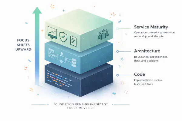 The debate about AI and software development is stuck on the wrong question. Most discussions ask whether AI writes good enough code, whether it matches human craftsmanship, whether it introduces bugs, whether developers can trust it. Reasonable questions. Increasingly beside the point. The shift that matters more isn’t about code quality. It’s about where engineering effort is required at all. AI is moving engineering up the stack, from writing code to designing systems to managing the lifecycle of software in production. The work doesn’t disappear. It shifts upward, toward broader and more structural concerns.